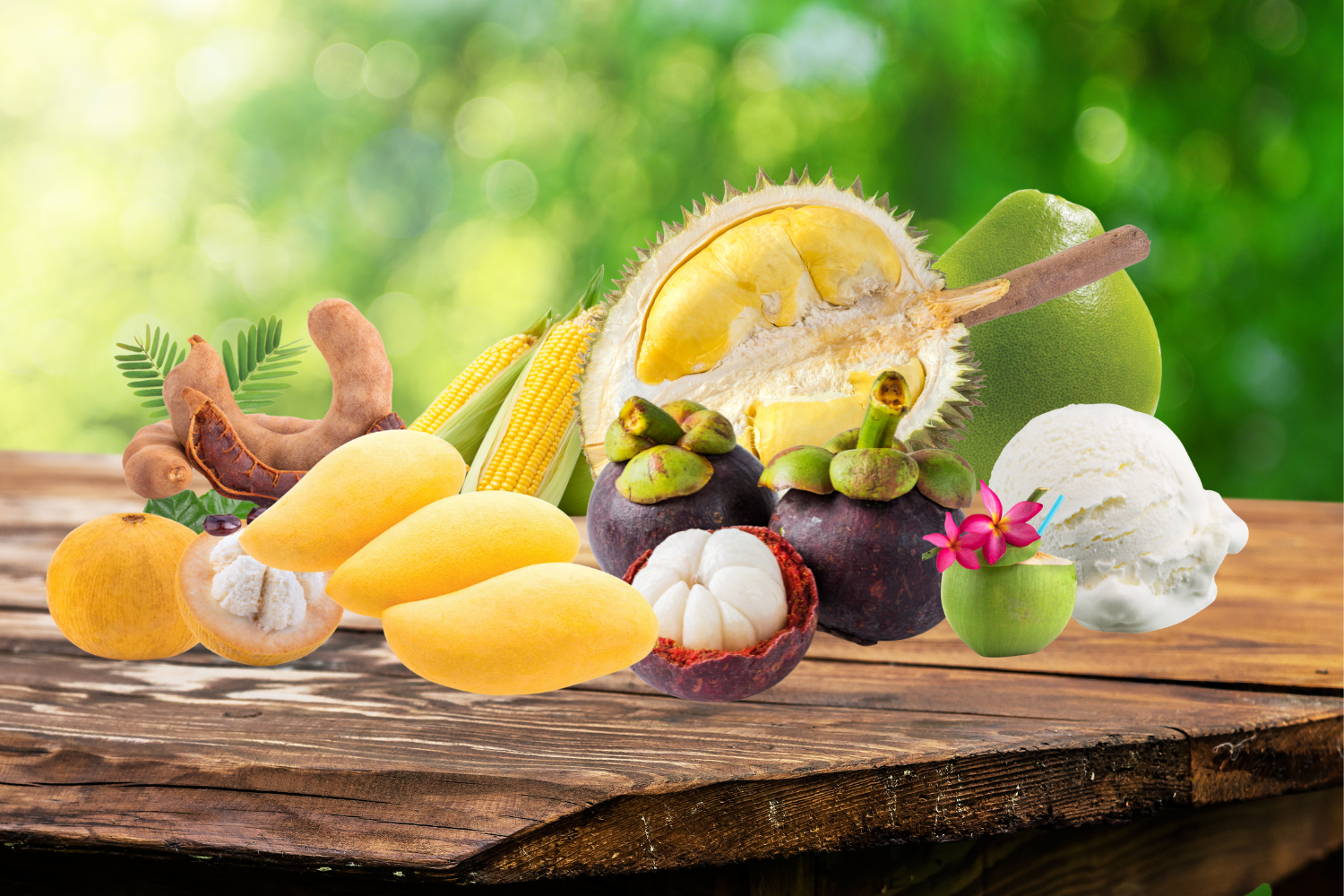 Fresh fruits: Durian, Longan, Mangosteen, Lychee, Papaya, Pineapple and more.