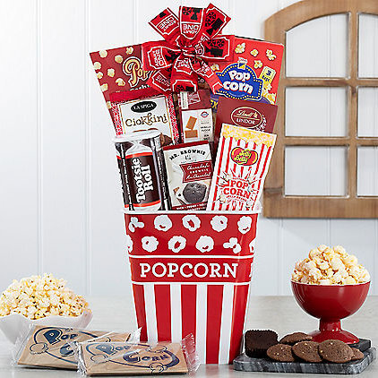 This nostalgic popcorn tub is filled with a collection of Popcornopolis kettle corn, Tootsie Rolls, Jelly Belly popcorn, vanilla fudge with sea salt, a brownie, three bags of microwave popcorn and more, perfect to enjoy during family move night.